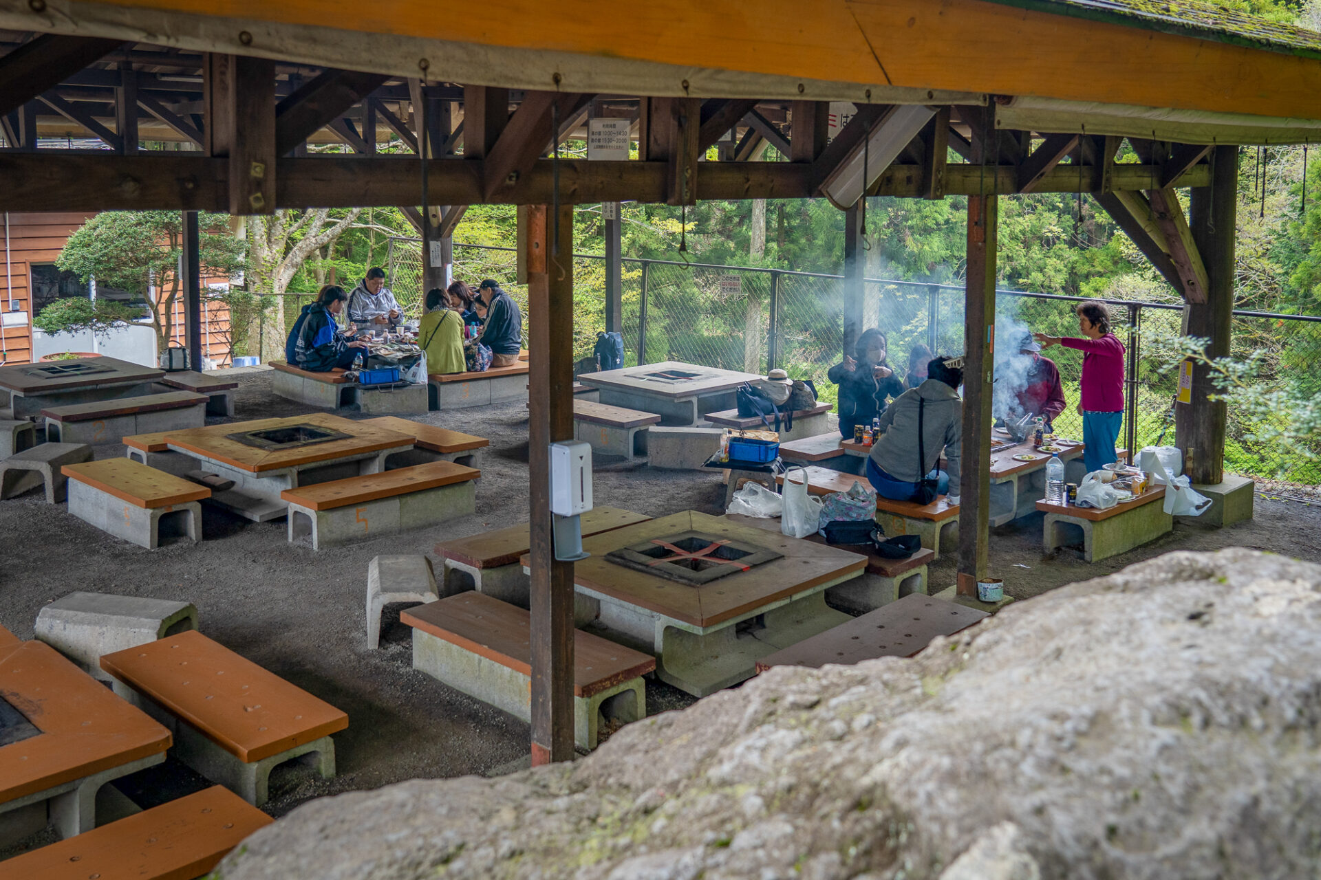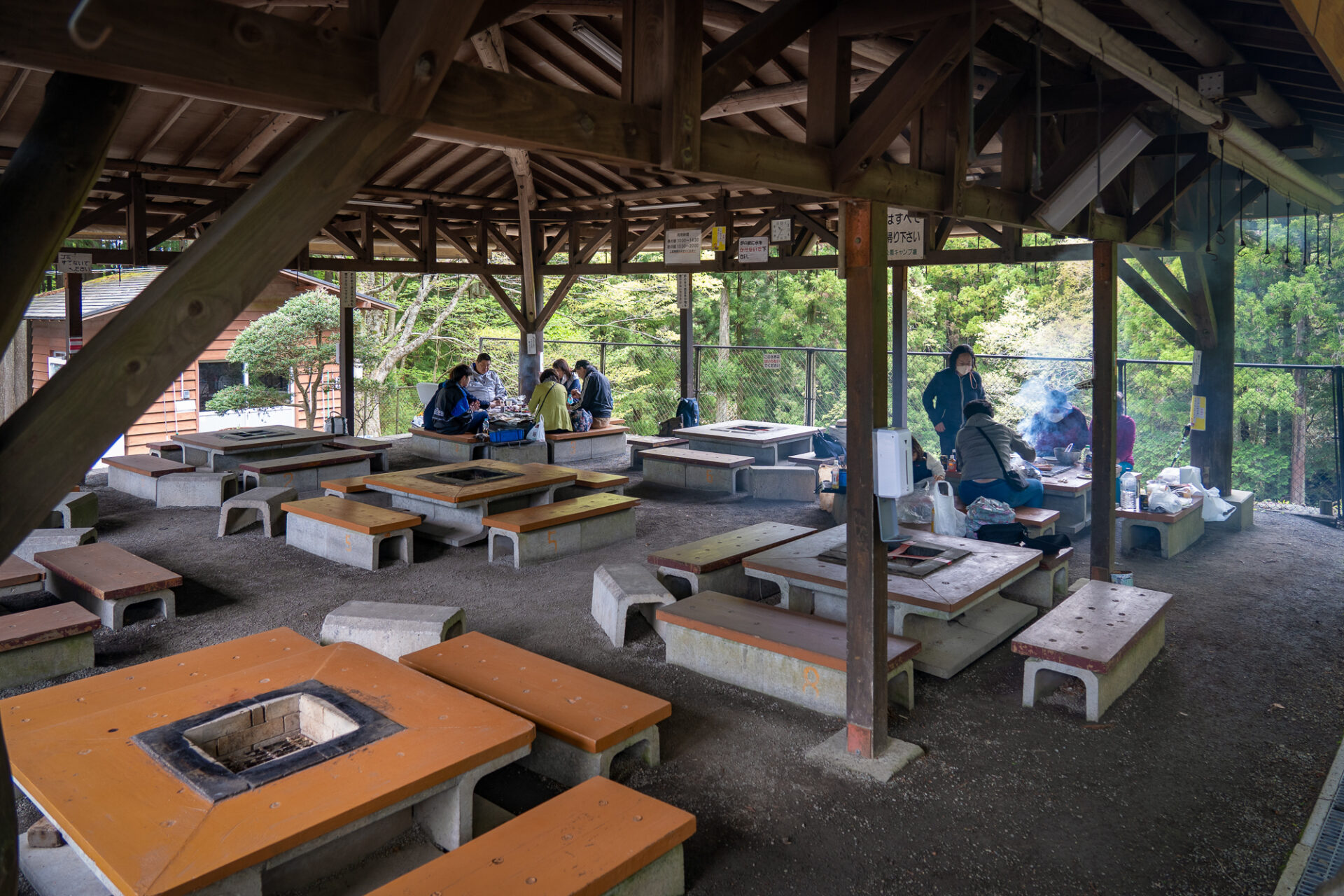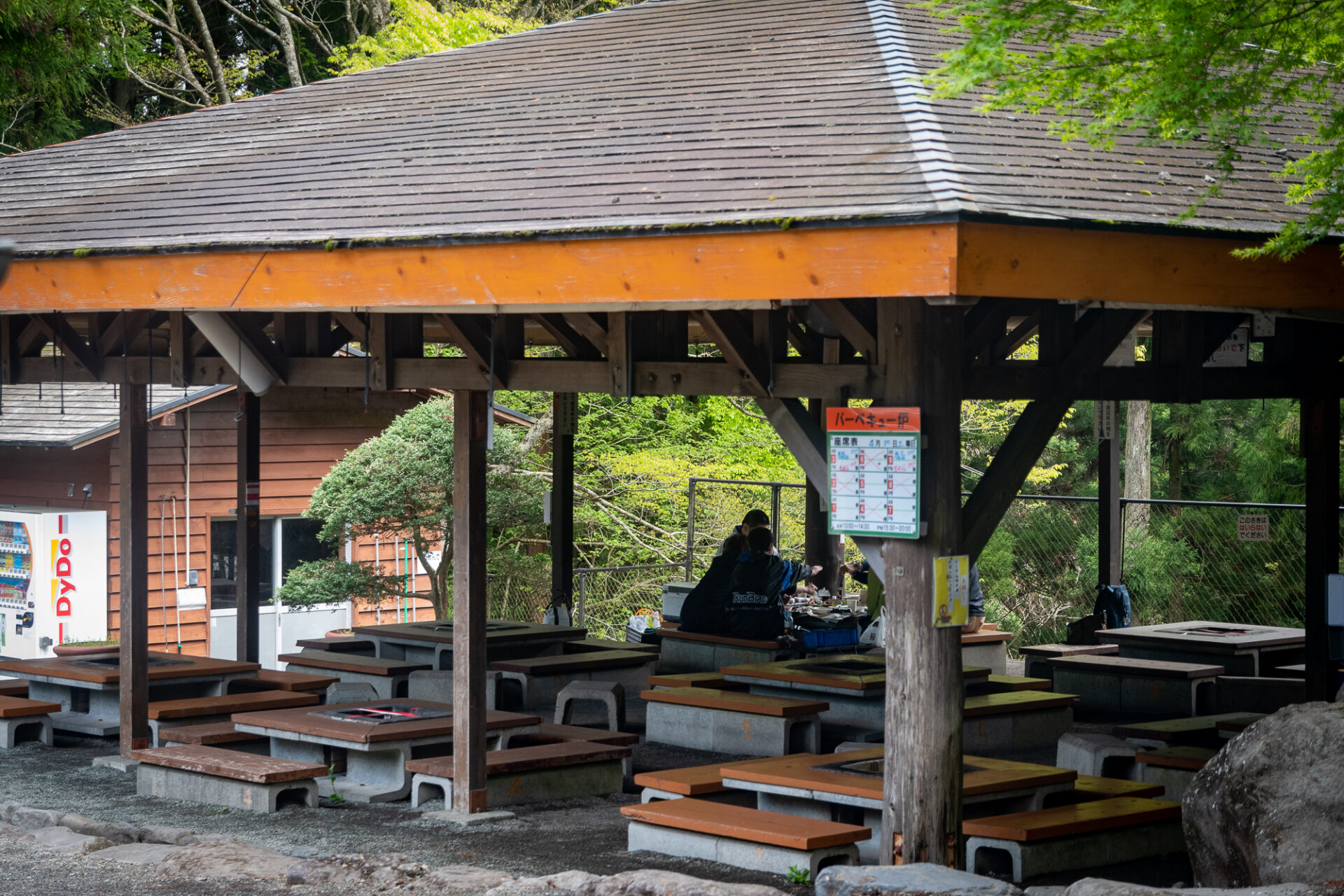 バーベキューサイトは、東屋タイプ(大屋根付き)で屋根の下にバーベキュー炉付きテーブル(大人8人用の腰かけ付き)が9基あります。(No.1~No.9)天候により、バーベキューサイトの側面シートを下ろすこともあります。(強風等で危険な場合は除く)