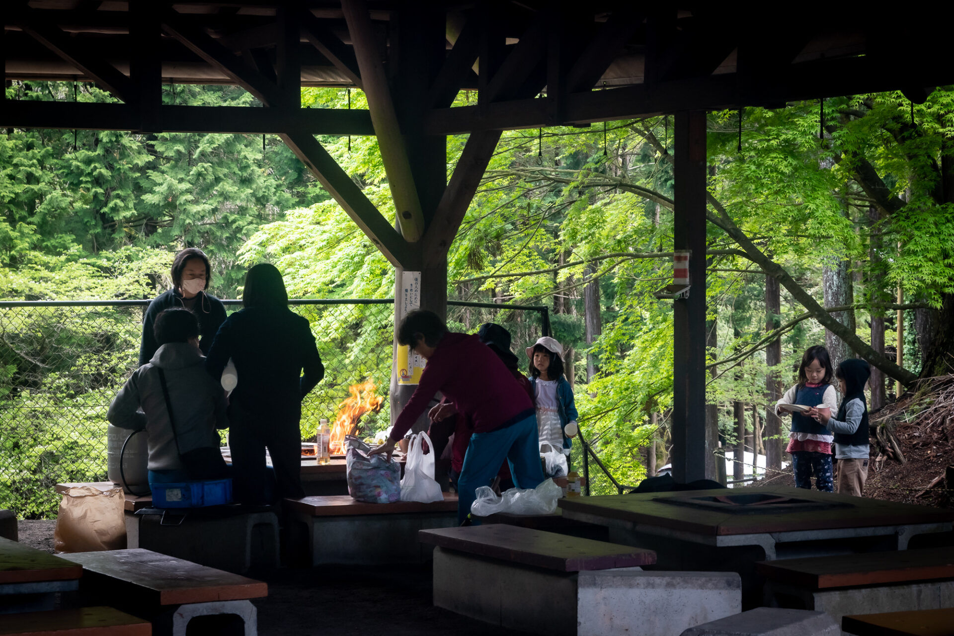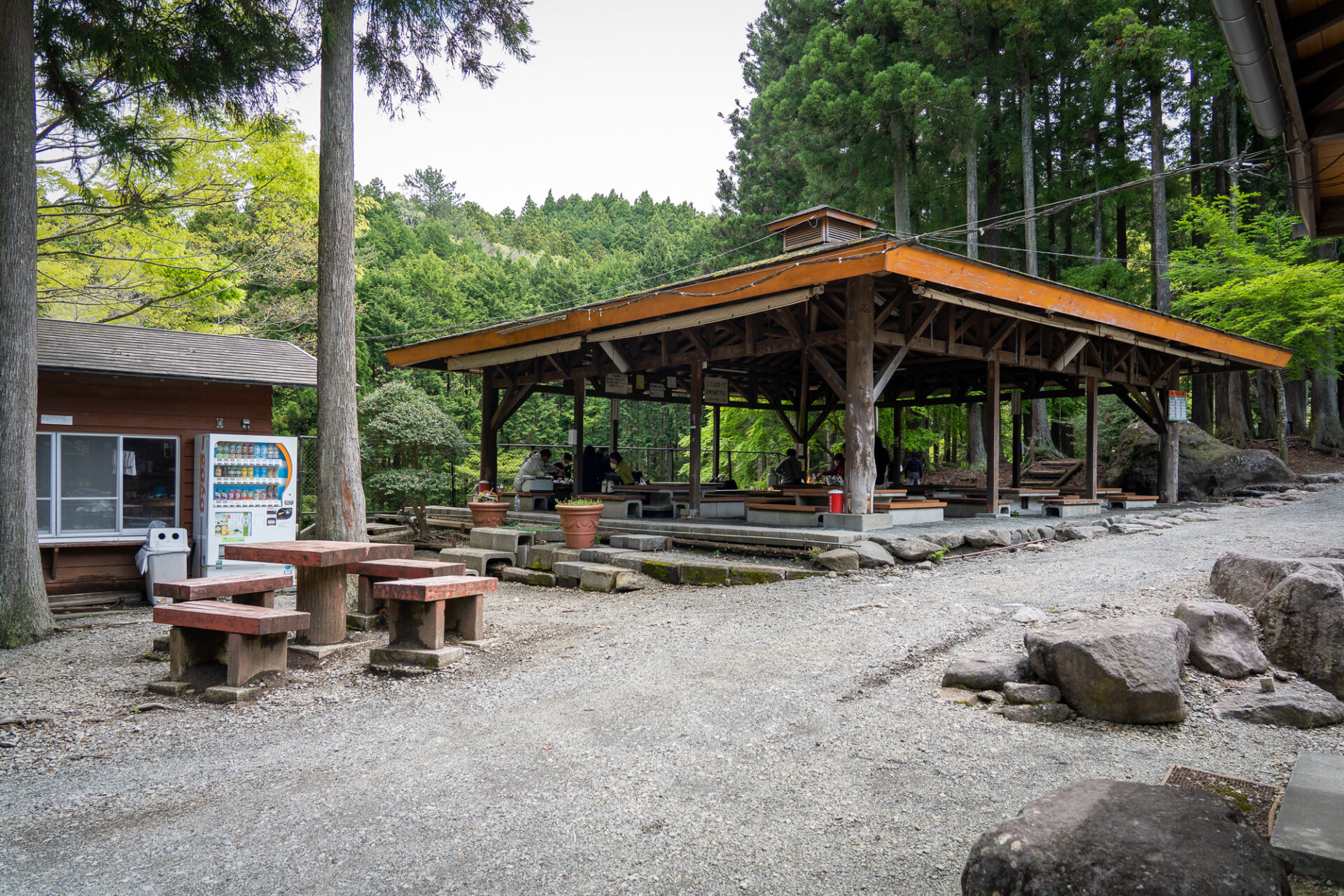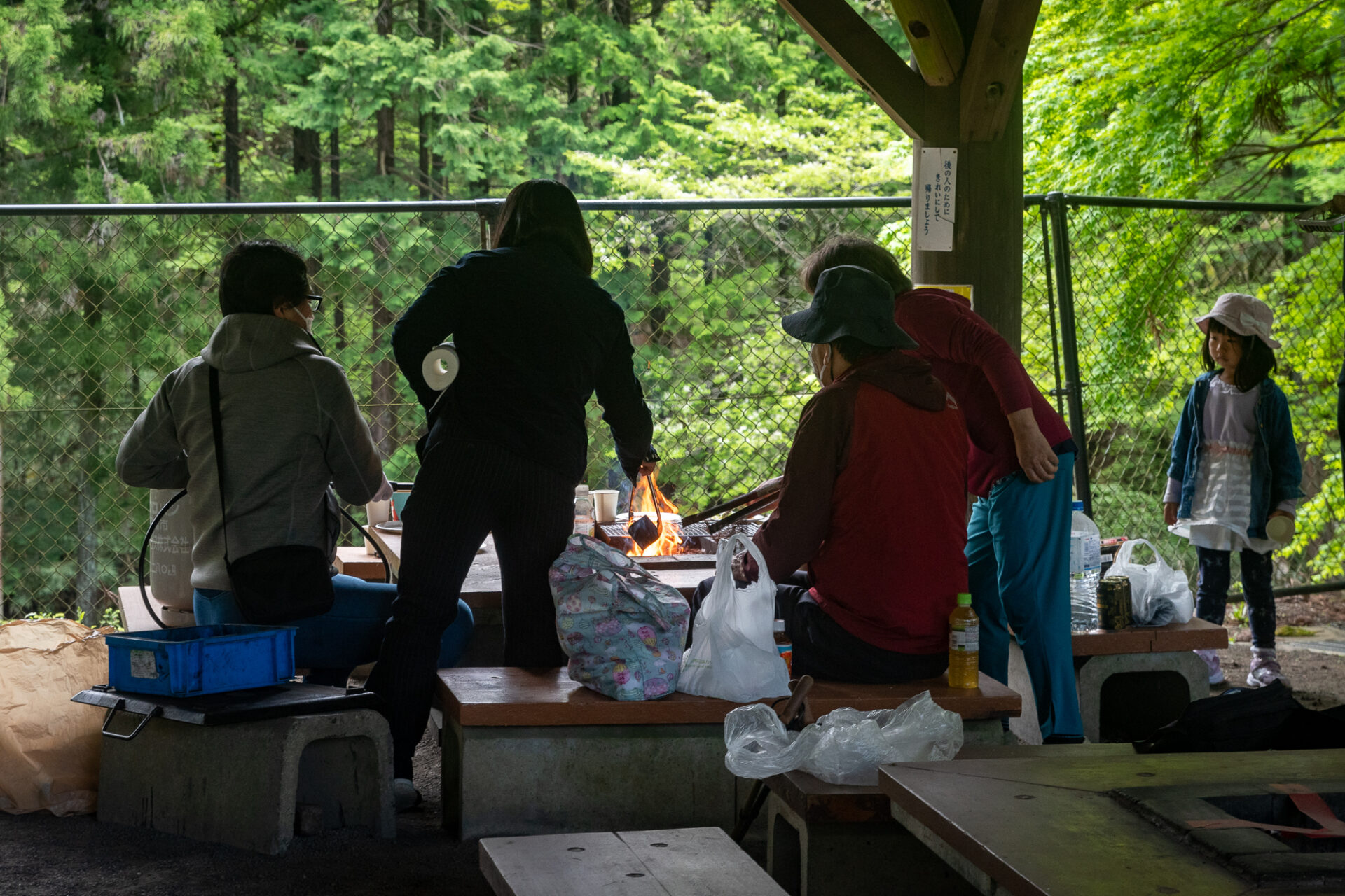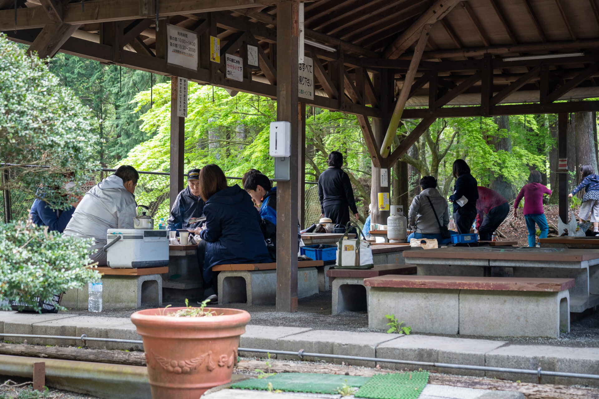 バーベキューサイトは、東屋タイプ(大屋根付き)で屋根の下にバーベキュー炉付きテーブル(大人8人用の腰かけ付き)が9基あります。(No.1~No.9)天候により、バーベキューサイトの側面シートを下ろすこともあります。(強風等で危険な場合は除く)